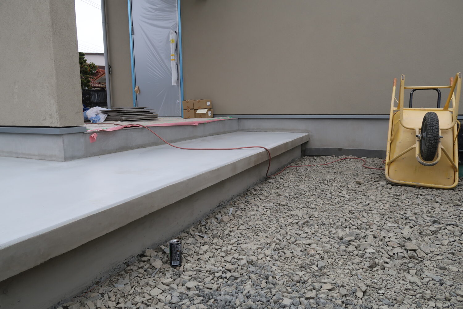 アプローチの土間打ちも終わり、コンクリート工事は駐車場のみです。